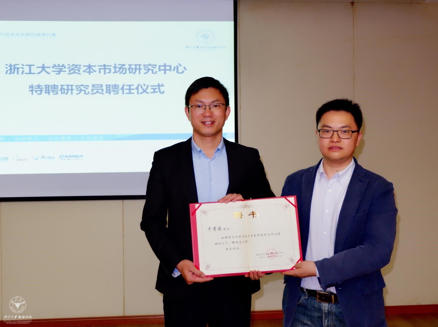 讲座开始前,资本市场研究中心副主任肖炜麟副教授向各位同学介绍了于孝建博士的履历和主要工作成就,并向于孝建博士颁发了资本市场研究中心特聘研究员的证书。
