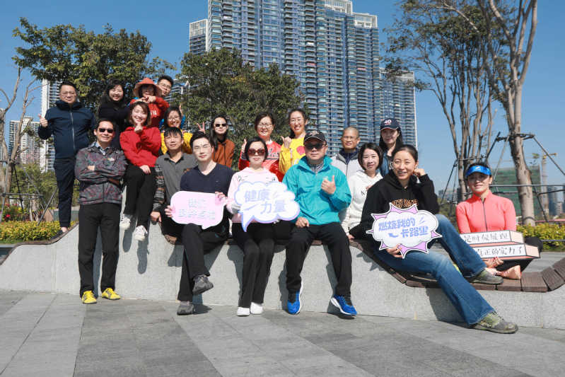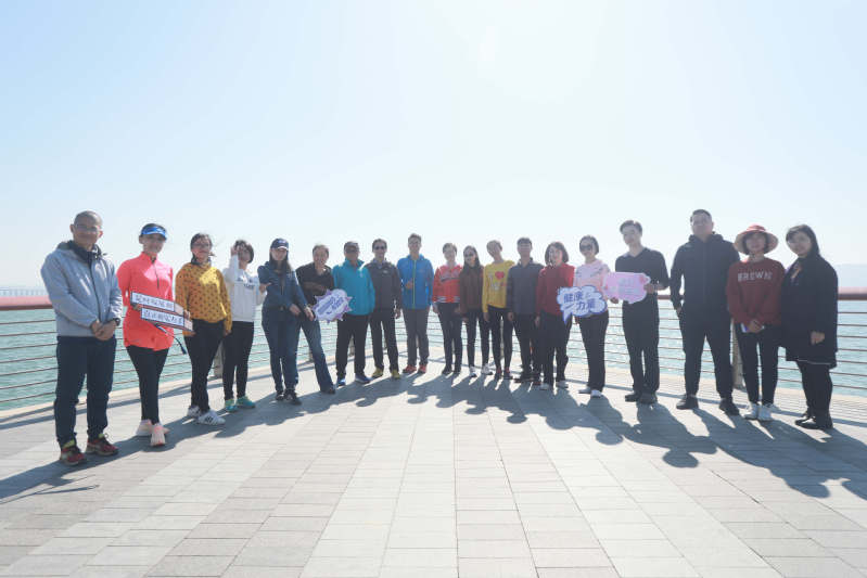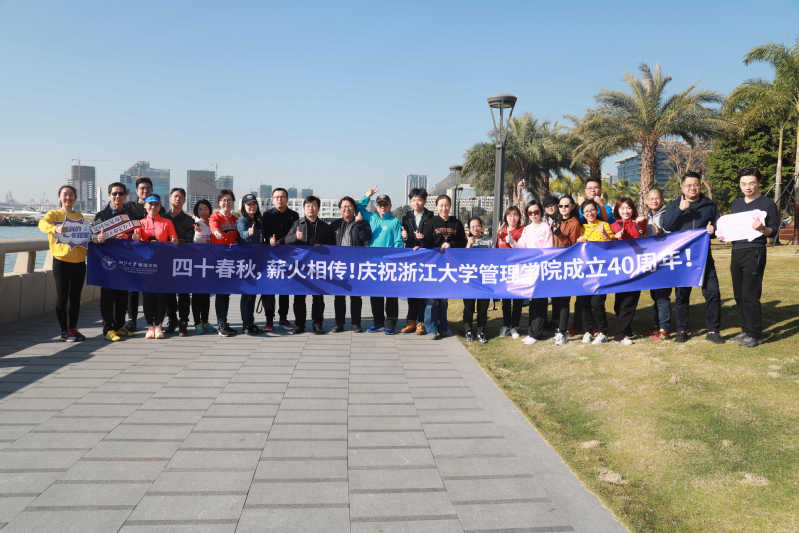 行进途中,校友们三五同行,欢歌笑语,一边遥望深圳湾大桥,欣赏海边的风景、享受惬意的阳光,一边驻足栈道围栏、青青草地,拍照合影留恋,并摆出各种造型为浙大管院送上祝福。