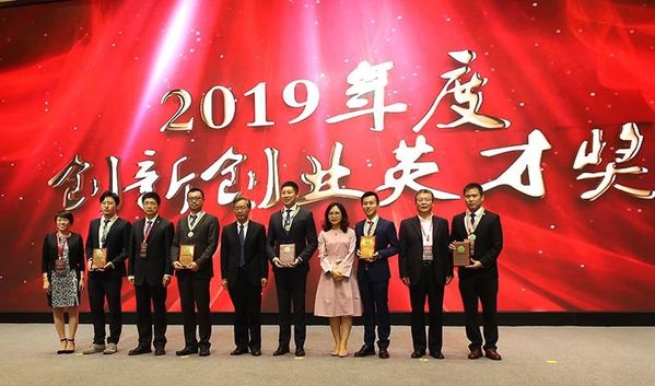 环球网页版博士生白云峰(右5)荣获“2019年度创新创业英才奖”