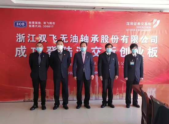 2020年2月18日,浙江双飞无油轴承股份有限公司上市,受疫情影响,无法在交易所敲钟,公司董事长戴着口罩在自家门口举行”敲钟仪式”。