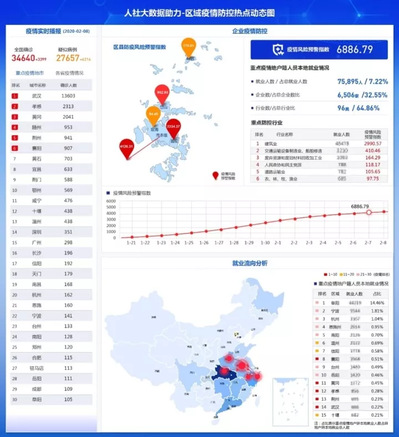 在人社行业,浙大网新上线了“人社大数据疫情防控系统”,通过全国实时疫情动态,结合本地企业用工来源地情况,对疫情防控形势进行主动预警,可以帮助政府在有限人力物力下按地域、按行业进行分级防控,可对重点疫情地用工企业进行精准提示,提醒相关企业关注防控形势,合理安排返工复工时间。目前该平台已在部分地市级人社机构试点应用。