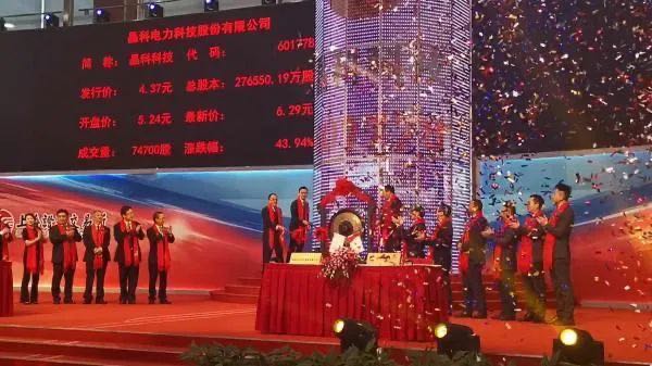 2020年5月19日,上海证券交易所恢复现场上市启动仪式。当天上午9时30分,作为国内首屈一指重量级光伏电站运营商,晶科电力科技股份有限公司,敲响疫情以来第一声现场上市鸣锣。