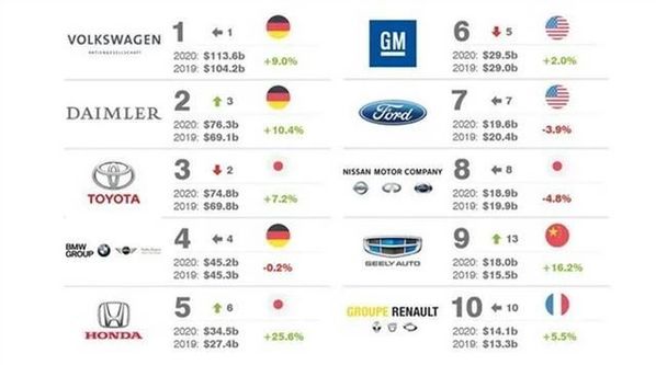 《2020年全球品牌组合价值最高的十大汽车集团》排行榜截图