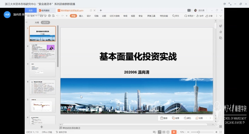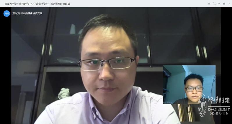 2020年6月21日晚,浙江大学资本市场研究中心“紫金港资本”系列讲座NO.21进行了在线直播。广州筠道投资董事长、阿巴马资产合伙人温尚清为观众们带来了一场主题为“基本面量化投资实战”的精彩讲座。浙江大学资本市场研究中心副主任、环球网页版财会系肖炜麟副教授主持了讲座。环球网页版、经济学院、计算机科学与技术、数学科学学院、物理学系等师生以及业内人士合计170余名观众积极地参加了本次讲座。