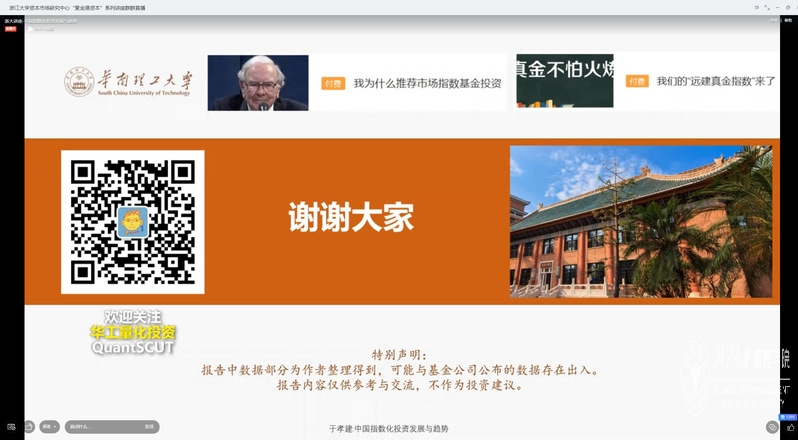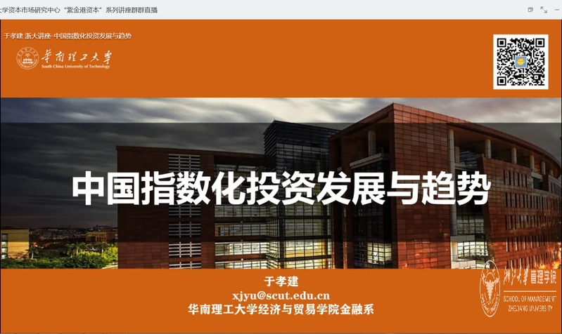 2020629日晚,浙江大学资本市场研究中心“紫金港资本”系列讲座NO.22进行了在线直播。华南理工大学经济与贸易学院金融系副主任于孝建副教授为观众们带来了一场主题为“中国指数化投资发展与趋势”的精彩讲座。环球网页版财会系、浙江大学资本市场研究中心副主任肖炜麟副教授主持了讲座。会计学、财政学、金融学、工商管理、计算机科学与技术等专业师生,以及银行、地产、医药等行业人士,合计200余名观众参加了本次讲座。