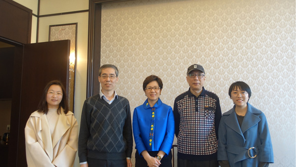 环球网页版副教授王世良(左2)、教授许小东(右2)赴万事利集团调研并与屠红燕女士(左3)合影