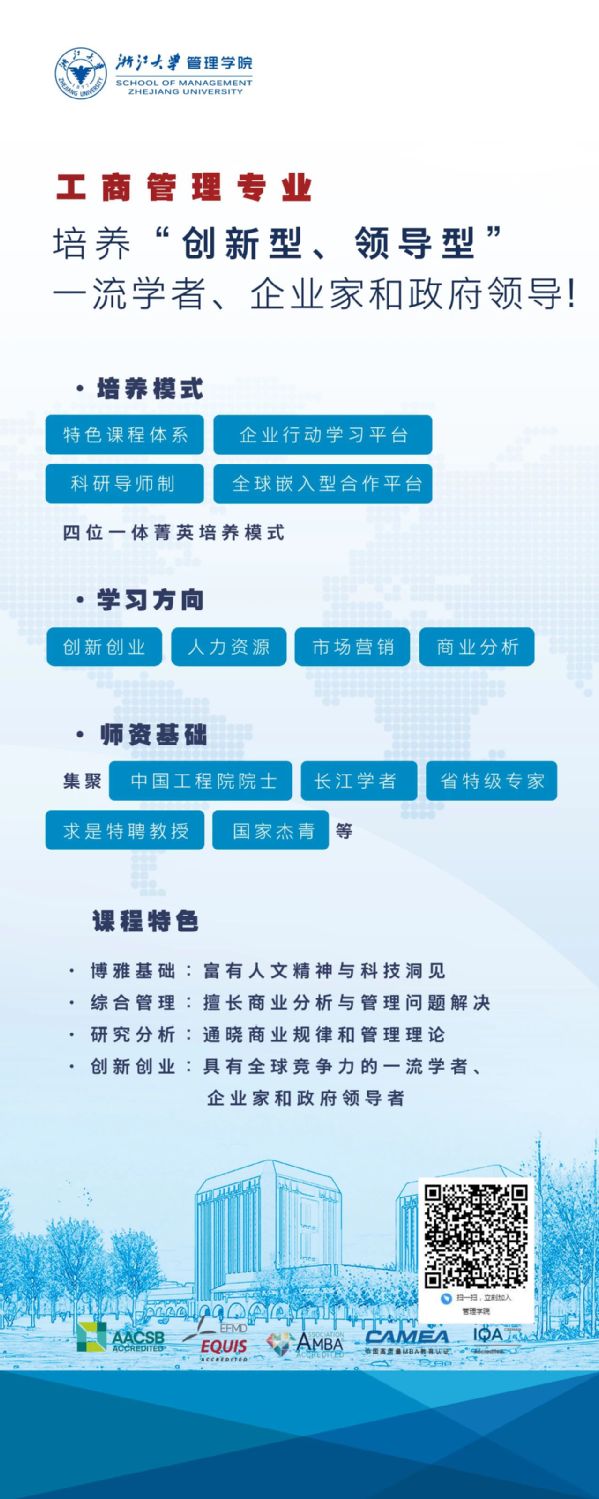 宣讲会上,你将了解到:改革优化后的管院本科专业是怎样的?哪个专业适合你?在管院的学习生活是什么“模样”?你对浙大管院本科专业的所有疑问,在这场宣讲会上都能得到解答。钉钉扫描海报上的二维码,即可加入圈子预约观看。