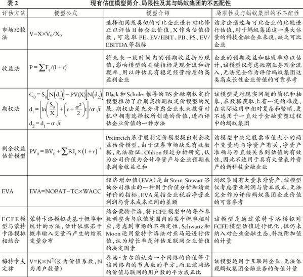 从单个估值方法来看,传统估值方法、对传统方法的修正与组合抑或是互联网企业估值方法都不能完全适用于类似于蚂蚁集团的金融科技企业的估值,其估值框架的局限性及其与蚂蚁集团的不匹配性如表2所示。