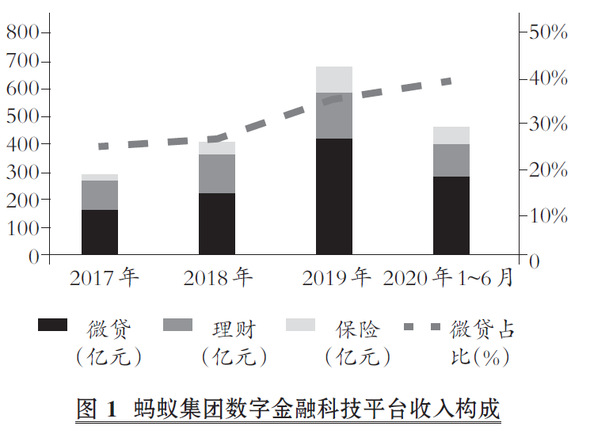 “数字金融科技平台”作为蚂蚁集团业务的核心板块,其价值创造源于“数字支付与商家服务”的流量转化。该板块的收入自2019年起超过“数字支付与商家服务板”板块,2020年1~6月其占比提高至63.39%。蚂蚁集团数字金融科技平台又可分为微贷科技平台、理财科技平台、保险科技平台,其各类业务收入分布情况如图1所示。