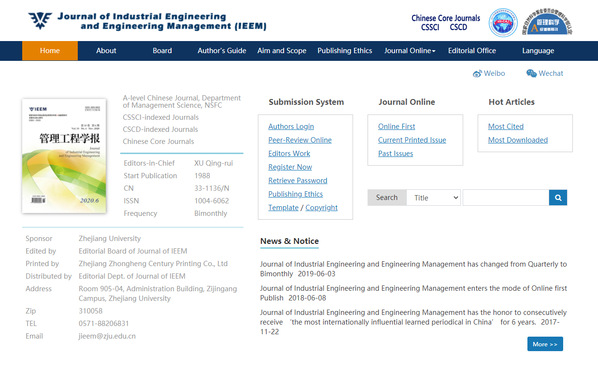 《管理工程学报》创刊于1988年,由教育部管理工程教学指导委员会委托浙江大学主办,是中国科学院文献情报中心认定的管理科学类重要期刊,被《中文社会科学引文索引》(CSSCI)、《中国科学引文数据库》(CSCD)、《中文核心期刊要目总览》收录。