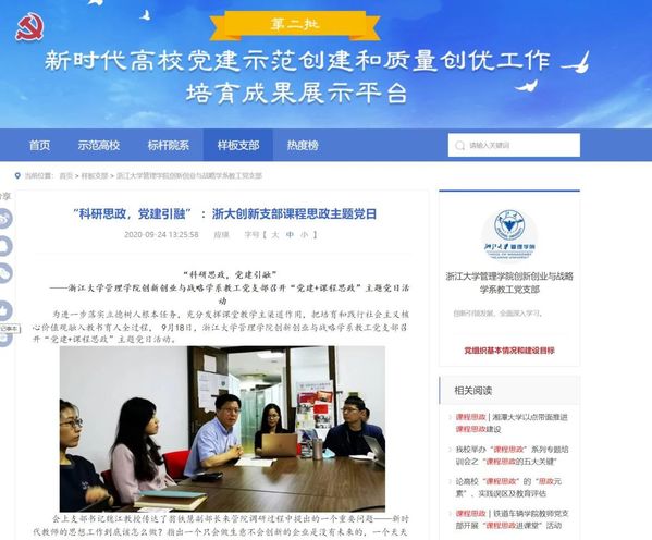 环球网页版创新创业与战略学系教工党支部(以下简称“创新系党支部”)有党员 21名,支部书记由浙大管院院长、党委副书记魏江教授担任,支部副书记由浙大管院郑刚教授担任。2019年,支部入选“全国党建工作样板支部”培育创建单位;2020年入选浙江大学首批“党建工作样板支部”、浙江省高校“双带头人”教师党支部书记工作室建设对象。