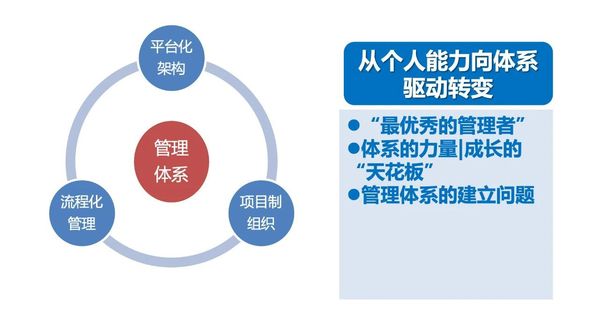 第二,管理体系的特殊性在于,它是在组织的业务发展过程中自然而然生长起来的。当业务做得非常大,已超过经验驾驭能力时,管理体系一定会有弊端。而要改变一个存在弊端的体系,难度和挑战同样大。