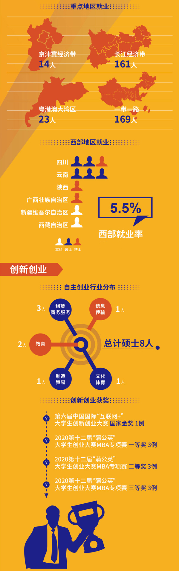 一方面,打造“引领工程”,通过“领志计划” 铸魂立志、“领航计划” 引领生涯,“领创计划”助力创新创业,着力培养兼具管理知识、科技洞见和人文精神,引领中国发展的健康力量;另一方面,在疫情暴发后第一时间开展包含在线就业指导服务活动在内的“网络战‘疫’•健康同行”五云建设,全年持续开展各类就业与升学指导活动26场,线下重点单位招聘宣讲座谈会9场,聘任“职业领航师”18位,一对一辅导参与学生540人次,团体辅导活动参与学生达1488人次。