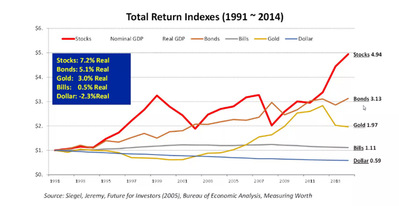 根据中国1991年-2014年金融大类资产表现,尽管波动很大,股权收益率仍超过其他资产的收益率。