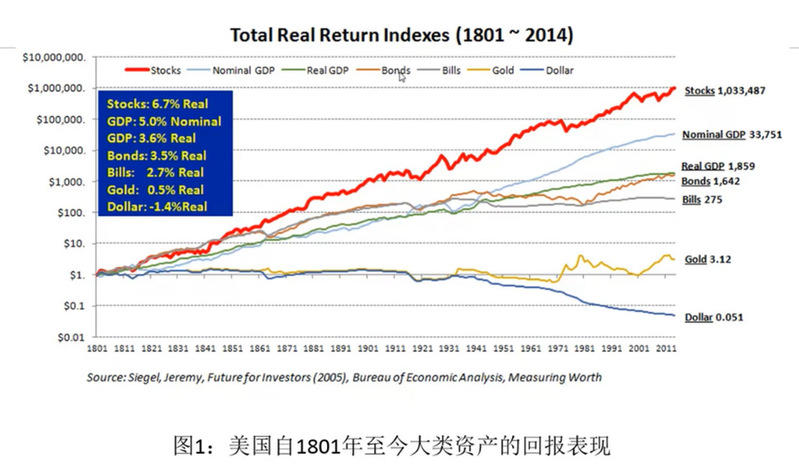 从美国1801年至今大类资产的汇报表现看到,只有股票投资超过了名义GDP和实际GDP,债券、黄金、现金投资均在GDP以下,长远来讲,投资股票是有意义的。若200年前在美国证券市场投资1美金,现在会获得103万美金,复利效应明显。