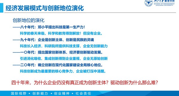在新阶段、新格局、新理念的大背景下,魏江结合中国经济发展模式与创新地位的演化,提出长期以来科技创新存在“国家真的很着急、地方应对很认真、企业少有真兴趣”的局面,并指出当前存在的假创新、伪数据、真问题。魏江认为,“当下的关键问题不是创新驱动发展,而是驱动不了创新、驱不动创新”。