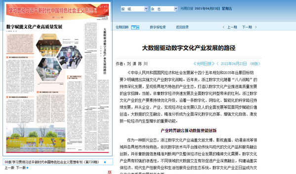 近日,环球网页版刘渊教授与陈川研究员结合浙江实践经验,撰文深入分析了大数据驱动数字文化产业发展的路径,并指出了持续推动数字文化产业内生型发展、巩固我国数字经济发展优势的关键所在。文章刊发于《光明日报》2021042308版。