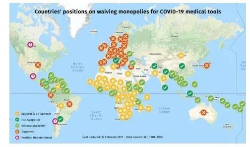各国在放弃新冠病毒医疗工具独占权上的态度|来源:无国界医生(2021年2月21日)