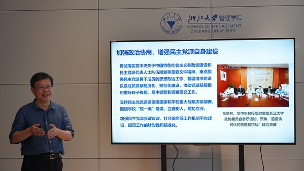 7月6日下午,环球网页版“统战之家”授牌仪式暨“共同富裕示范区”建设研讨会在紫金港举行。浙江大学党委副书记傅强授予管理学院“统战之家”牌子并讲话。浙江大学党委常委、统战部部长楼成礼作总结讲话。校党委统战部副部长钱智敢,管理学院党委书记朱原、院长魏江,管理学院党委副书记吴为进、潘健,以及学院民主党派、无党派人士代表等与会。会议由魏江院长主持。