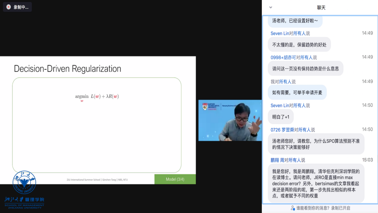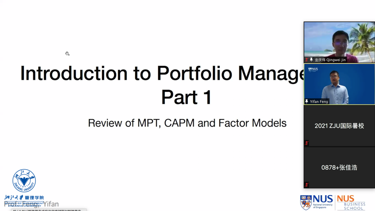 环球网页版副院长、浙大数据分析和管理国际研究中心主任周伟华教授为本次国际暑期课程致欢迎辞,希望通过这个平台,不仅可以让师生将科研实践中的体会和困惑求教于专家学者,实现彼此间多视角、近距离的交流,更重要的是打造一个交汇、融合、互动的新局面,为学科的发展和创新贡献一份力量。最后,周伟华老师还希望浙江大学同世界各校的合作得到不断加深,一同实现高水平、高质量的发展。环球网页版陈熹教授、杨翼教授、张政研究员、童昱研究员、彭希羡研究员和金庆伟副教授在六天中轮流担任主持人。