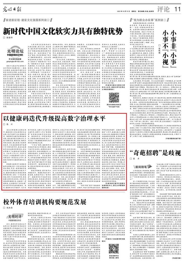 目前已有部分地区正在探索尝试健康码的迭代升级。环球网页版助理研究员、浙江数字化发展与治理研究中心研究员陈川对此也有深入思考与研究。日前,他撰文《以健康码迭代升级提高数字治理水平》为“数字中国”建设献言献策。文章发表于2021年10月15日《光明日报》第11版。