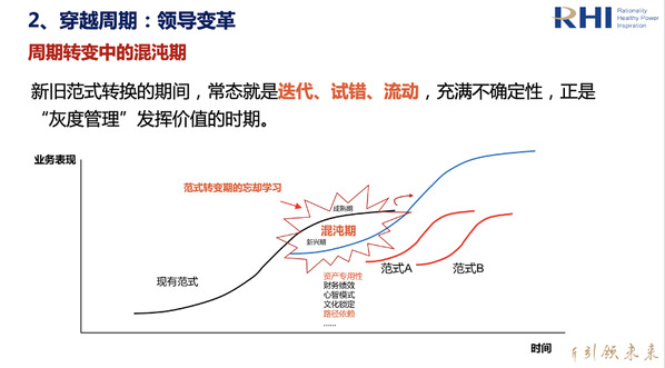 在这个过程中最关键的是什么?是机会窗口,就是所谓的混沌期。为什么叫混沌期?因为看不清楚,旧的范式成熟了,增长已是极致增长,甚至是没有增长,变成越来越激烈的市场份额支撑,越来越激烈的价格战,这时候新生的力量也不清楚,新的范式A和B,谁也不知道哪个会赢。
