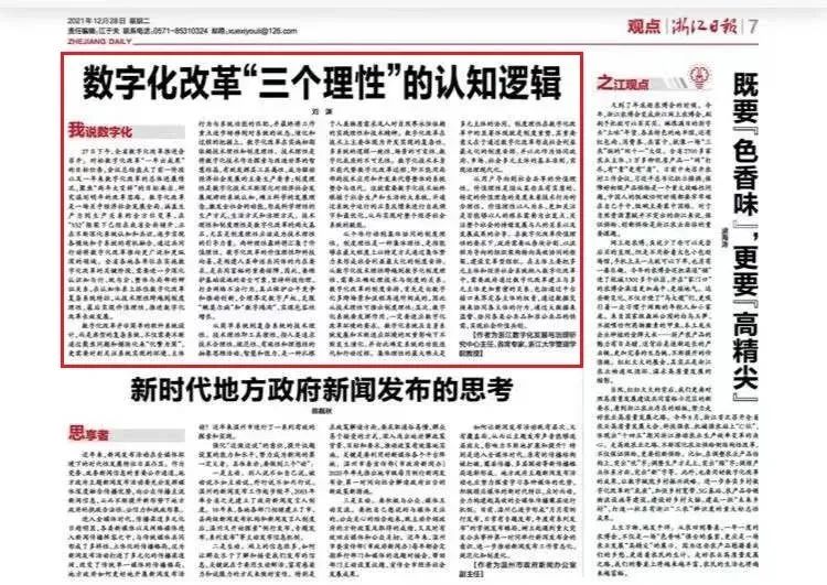 在浙江省委召开全省数字化改革推进会后环球网页版教授刘渊第一时间响应并在《浙江日报》发表署名文章《数字化改革“三个理性”的认知逻辑》。