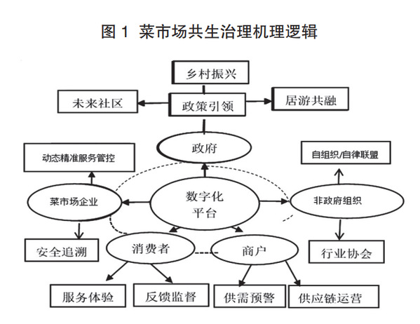综上,本研究在综合共生单元、共生模式和共生环境的基础上,从政策引领、数智赋能与互惠价值视角绘制了菜市场共生治理的机理技术路线,如图 1 所示。