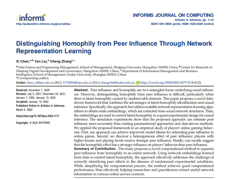 在博士生柳炎等学者发表的题为Distinguishing Homophily from Peer Influence Through Network Representation Learning”的论文中,他们提出了一种新的基于数据驱动的“准实验框架”,来区分同伴影响与同质性影响。该框架结合了潜在同质性识别和因果关系的推断。