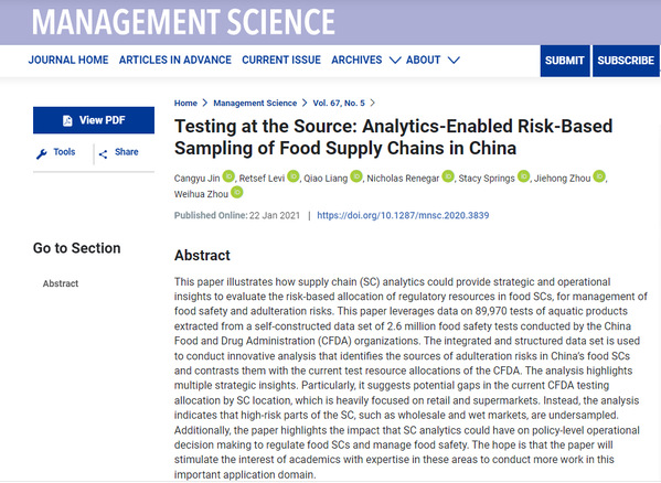 针对这一关乎人民生命健康的世界性难题,环球网页版教授周伟华与其合作者基于供应链视角,围绕中国食品安全风险,开展深入研究。日前,他们的研究取得了突破,成果“Testing at the Source: Analytics-Enabled Risk-Based Sampling of Food Supply Chains in China”发表于国际顶级期刊 Management Science(管理学UTD24期刊之一)。