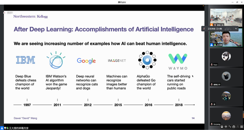 王博士本次报告系统回顾了人类决策研究与人工智能技术的关系与发展脉络,并介绍了自己近期发表在Journal of Personality and Social Psychology上基于人工智能的人脸识别大数据研究。首先,王博士介绍了卡耐基学派的赫伯特·西蒙、詹姆斯·马奇等学者提出的决策理论,这些理论不仅揭示了个人决策的有限理性特征,还将整个组织视为一个决策主体。同时,他指出西蒙等学者在上个世纪六、七十年代已经开始思考计算机的发展如何辅助人类做出更优的决策、如何改变传统的组织决策理论,并出版了有关早期AI特征与表现的相关著作——The Science of Artificial Intelligence. 随后,他进一步介绍了AI技术的两个主要发展阶段,并指出谷歌公司于2012年提出的深度学习网络是上述两个阶段的分水岭。第一阶段中的AI主要指的是基于设计的AI,也即AI主要以人类设定的规则为基础(rule-based AI)开展各项计算与决策,因此仍然非常依靠人类智能,也很难避免决策中的有限理性;而第二阶段中的AI则主要指的是基于自学习的AI,它们可以从人类提供的海量数据当中基于深度学习网络开展自我学习并决策。而借助自学习AI,人类有了不断趋近完美决策(substantive decision-making)的可能性。