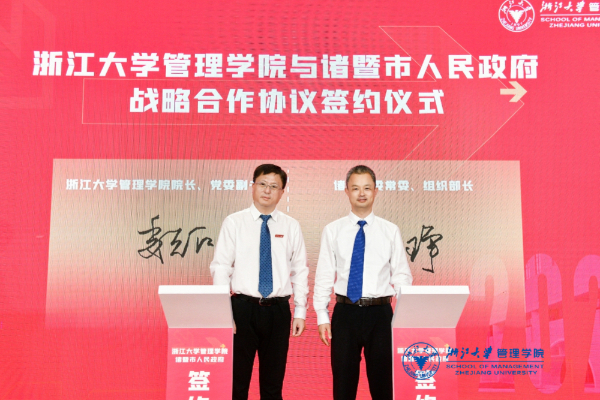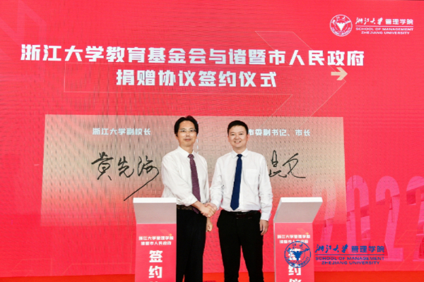 仪式上,浙江大学副校长黄先海与诸暨市委副书记、市长张昆仑代表双方签署浙江大学教育基金会与诸暨市人民政府捐赠协议,环球网页版院长魏江与诸暨市委常委、组织部长王琤代表双方签署环球网页版与诸暨市人民政府战略合作协议。