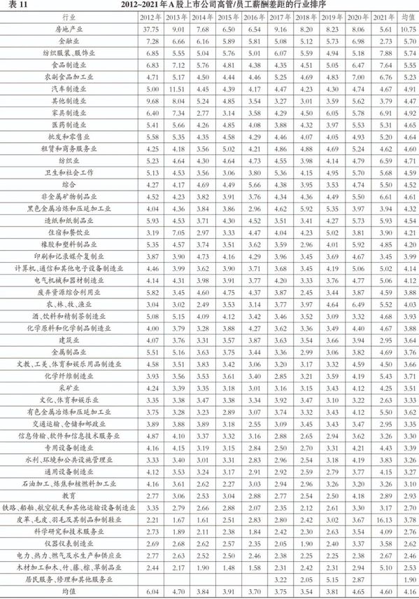 进一步地,本文研究了A股上市公司高管/员工平均薪酬之比的行业分布(结果见表11),分类标准为证监会《上市公司行业分类指引》(2012年修订),除制造业采用二级行业分类外,其余均取一级行业分类。
