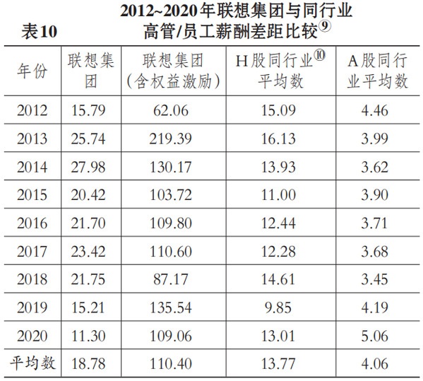表10列示了联想集团高管/员工薪酬之比与A股、H股同行业平均数的比较。由表10可见,2012~2020年,联想集团的高管/员工薪酬差距(不含权益激励)平均值为18.78倍,远高于A股同行业公司的均值4.06倍,也高于H股同行业公司的均值13.77倍,这展现了联想集团对高管薪酬的“慷慨”和对广大“知识创造者”的“吝啬”。