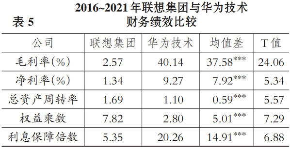 表5选取了毛利率、净利率、总资产周转率、权益乘数和利息保障倍数等财务指标对联想集团和华为技术进行对比分析。在盈利能力指标上,联想集团显著弱于华为技术,2016 ~ 2021年年均毛利率比华为技术低37.58%,净利率比华为技术低7.92%,而总资产周转率却显著高于华为技术;
