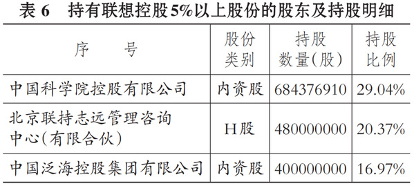 根据联想集团2021年披露的招股说明书可知,联想控股通过直接和间接持股及前述一致行动安排可行使发行人已发行股份表决权的43.48%,为发行人的控股股东。联想控股的股权较为分散,持有联想控股5%以上股份的股东如表6所示,联想控股的董事会不存在由单一股东或多名股东联合控制的情况,因此联想集团无实际控制人。