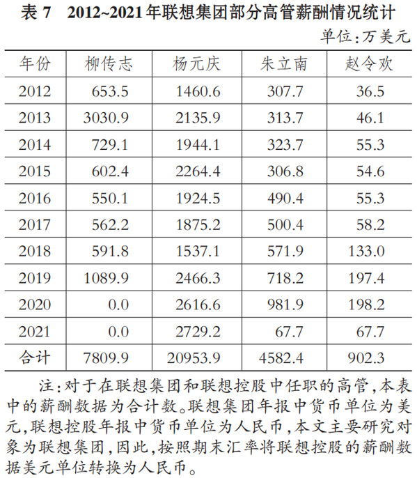 ⑦实际上,从联想集团的年报来看,柳传志从2012年开始就未在联想集团领取薪酬。而联想控股的年报显示,2012~2019年柳传志共从联想控股领取薪酬7809.9万美元,其中,2013年的总薪酬高达3030.93万美元。杨元庆2012~2021年薪酬合计高达近2.1亿美元,堪称“天价薪酬”。而朱立南2020年从执行董事转为非执行董事后,薪酬不降反升,从4800万元上涨为6200万元。