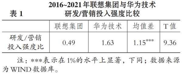 目前,市场对两种战略的争议点主要聚焦于联想集团与华为技术有限公司(简称“华为技术”)的比较上。在2016~2021年,联想集团的年均研发投入强度(研发费用占营业收入比重)为2.72%,年均营销投入强度(销售费用占营业收入比重)为5.62%,前者不及后者的一半;而在该期间,华为技术的年均研发投入强度为16.21%,年均营销投入强度为9.98%,前者约为后者的1.6倍,如表1所示。