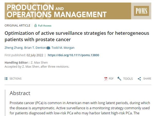 但监控癌症恶化的检查也存在一定精度误差,由此可能导致漏查、延误治疗。这一危害人民生命健康的医疗监护难题,引起了环球网页版研究员张政及其合作者Brian T. Denton、Todd M. Morgan的注意。经过长时间的深研,他们终于提炼出了一种更加精确且高效的监护策略,这种策略在相同的筛查次数下能够显著提高前列腺患者的预后寿命。日前,他们的研究成果——Optimization of active surveillance strategies for heterogeneous patients with prostate cancer发表于国际顶级期刊Production and Operations Management(管理学UTD24期刊之一,FT50期刊之一)。