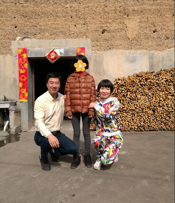 2017年金鹰副会长(左1)携夫人前往结对贫困生家中看望(为避免隐私暴露,特对贫困生进行遮挡处理)