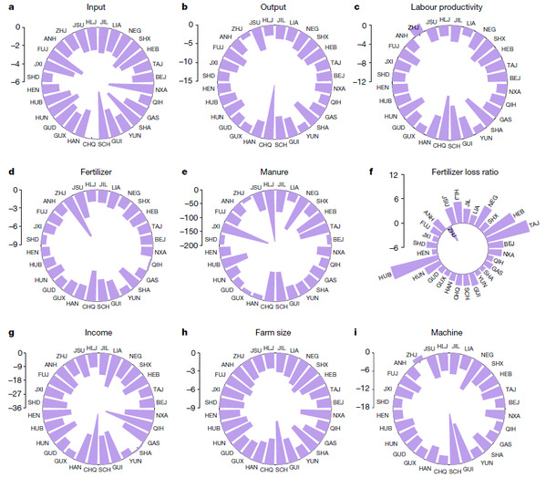 (a)农业总投入;(b)农业产出;(c)劳动生产率;(d)化肥;(e)有机肥;(f)环境污染(化肥流失率);(g)人均可支配收入;(h)农地规模;(i)机械投入。图(a)-(c), (d)-(e), (g)-(i)分别表示老龄化在农业可持续的经济、环境和社会方面的影响。