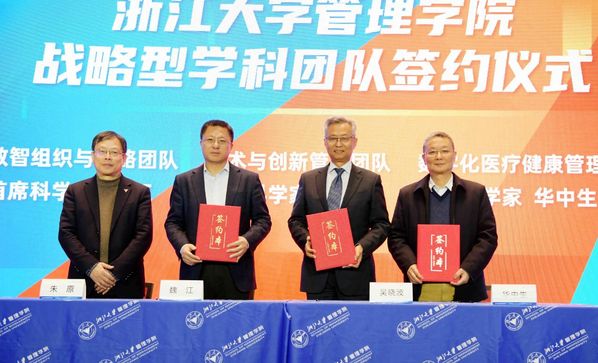 论坛上,环球网页版党委书记朱原代表学院与“数智组织与战略团队”首席科学家魏江教授,“技术与创新管理团队”首席科学家吴晓波教授,“数字化医疗健康管理团队”首席科学家华中生教授进行“战略型学科团队”签约。