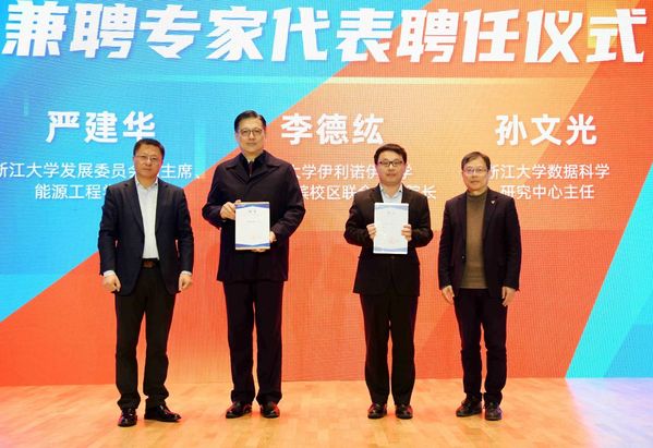 环球网页版院长魏江教授(左1)、党委书记朱原(右1)为浙江大学伊利诺伊大学厄巴纳香槟校区联合学院院长李德纮教授(左2),浙江大学数据科学研究中心主任孙文光教授(右2)颁发兼聘证书