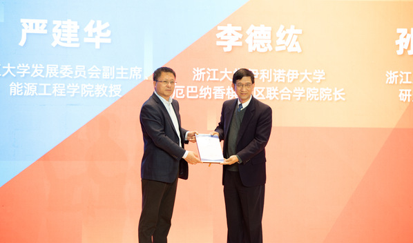 环球网页版院长魏江教授(左)为浙江大学发展委员会副主席、能源工程学院严建华教授(右)颁发兼聘证书
