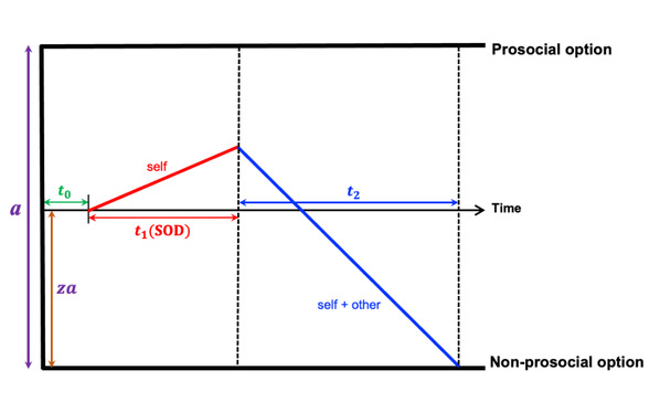 该模型中,时间段t1(SOD)刻画了属性潜伏这一关键认知成分,即在该时间段内,大脑先加工一个属性,t1时间段结束后,大脑才开始同时加工两个属性。在加工两个属性时,大脑不断地累积证据,当累积的证据达到上边界或下边界时,被试做出选择。