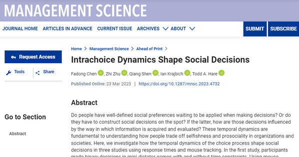 近日,环球网页版“百人计划”研究员陈发动与其博士生朱芝,联合上海外国语大学沈强教授、俄亥俄州立大学Ian Krajbich教授、苏黎世大学Todd Hare教授共同在国际顶级期刊Management Science(管理学UTD24期刊之一)上发表了一项研究——Intrachoice Dynamics Shape Social Decisions。