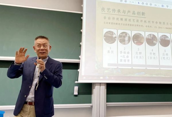 因为在她看来,江亮打造匠品的故事和他“一生只做一件事,一心只为酿好酒”的坚定信念可以让同学们深受匠心精神感染,而她希望这种感染可以尽可能覆盖更多同学。于是,在疫情之后的最近,她成功邀请到江亮来到管院,并将《品牌创建与管理》《营销策划》两门课的本科生召集在一起,共同聆听江亮讲述他如何在宋韵文化传承中践行工匠精神。