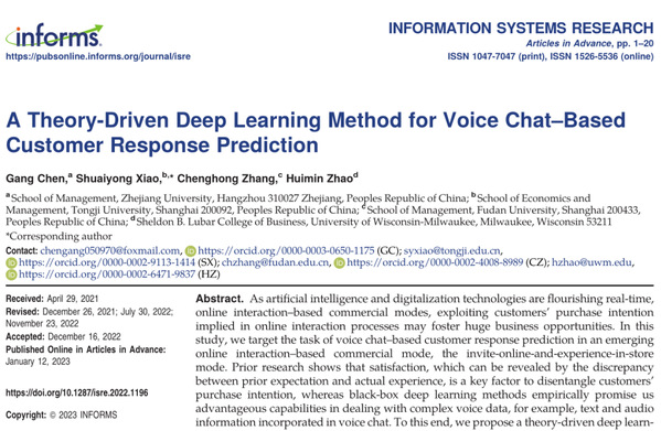 日前,陈刚与团队在国际顶级期刊Information Systems Research(UTD24期刊之一)上发表了他们的研究成果A Theory-driven Deep Learning Method for Voice-chat- based Customer Response Prediction。他们的研究聚焦于“在线语音客户邀约对话场景”,构建了一个能够帮助商家进一步了解消费者的偏好和购买意愿的模型,为提高客户购买转化率提供了重要参考价值。