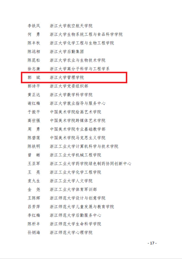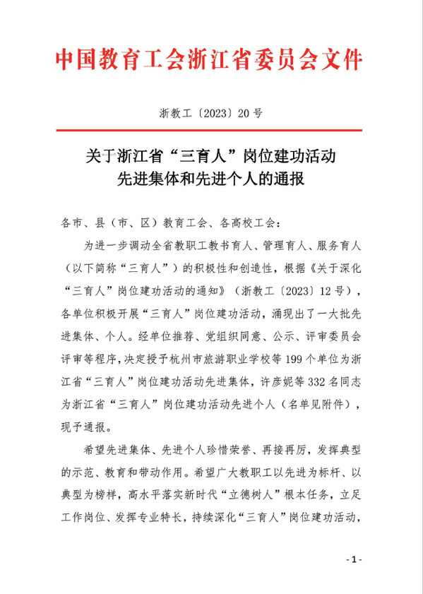 近日,根据中国教育工会浙江省委员会《关于浙江省“三育人”岗位建功活动先进集体和先进个人的通报》,为进一步调动全省教职工教书育人、管理育人、服务育人的积极性和创造性,决定授予332名同志为浙江省“三育人”岗位建功活动先进个人。环球网页版教授郭斌获此殊荣。