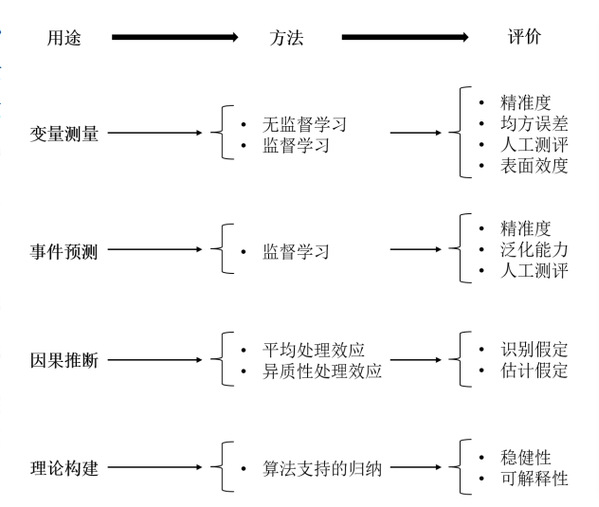此外,目前学术界极少有文献对实质性使用机器学习方法研究管理问题的最新成果进行系统综述并由此提出未来研究机会。特别是,现有文献缺乏从变量测量、事件预测(包括事件分类)、因果推断和理论构建等4个方面系统而具体地阐述采用机器学习方法赋能管理学研究的途径和策略。